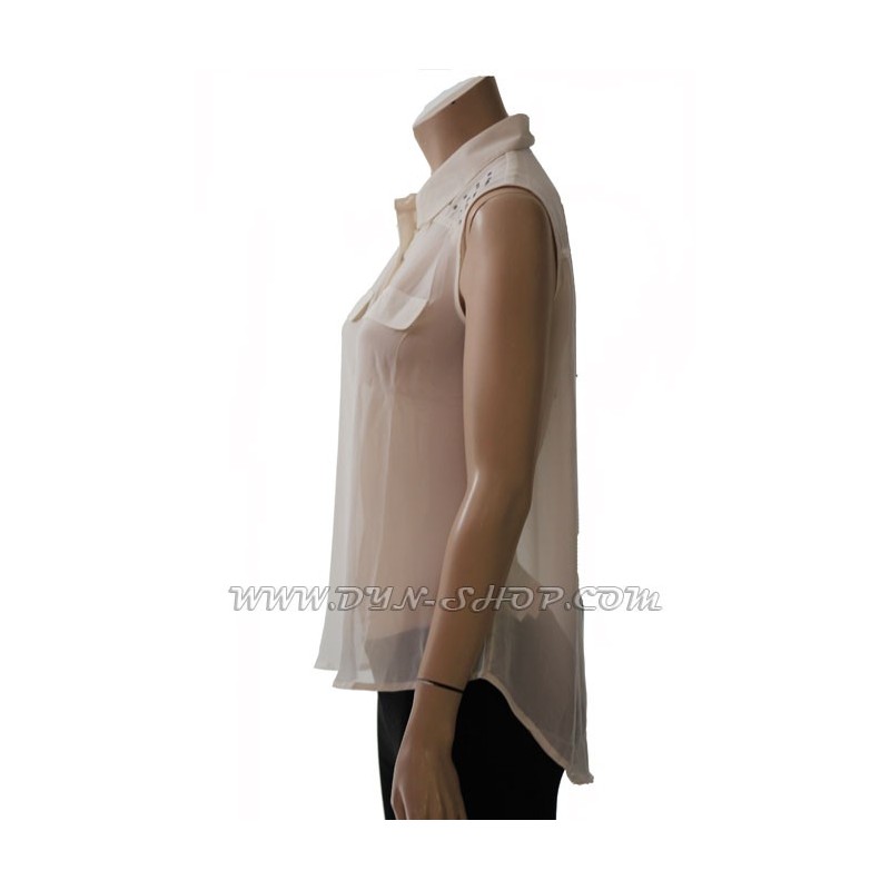 Blusa sin mangas en color crema con tachuelas en la parte de arribo y dos solapas ( no tienen bolsillo).
