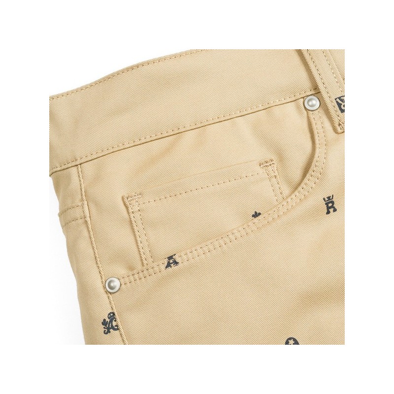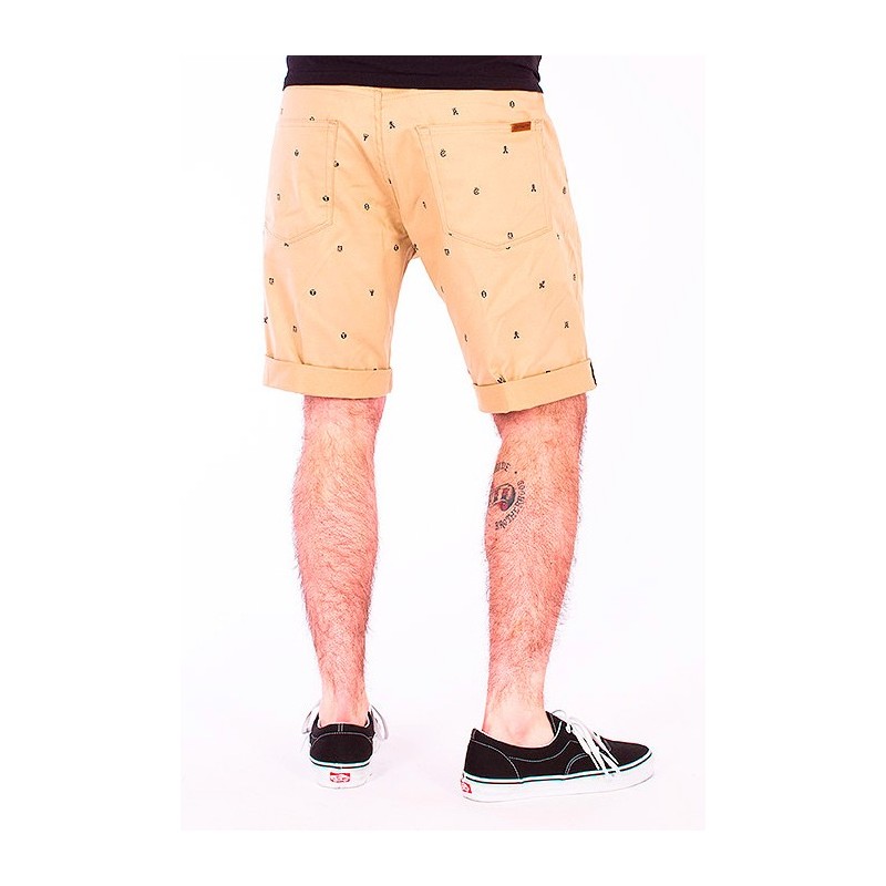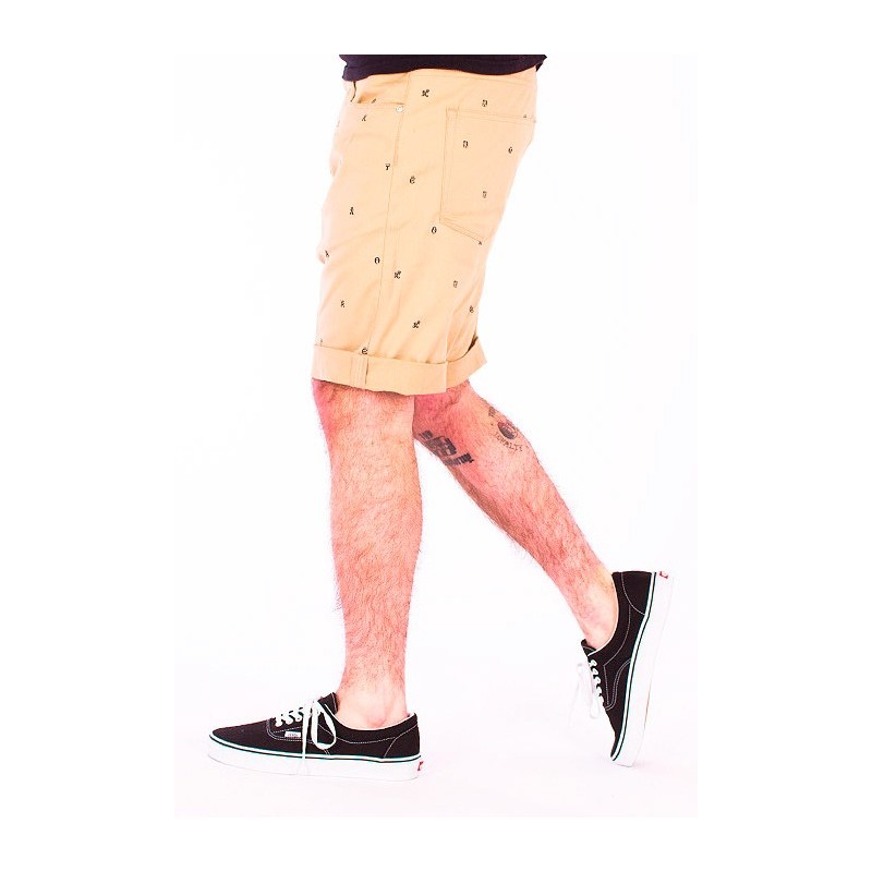 Esta Bermuda Carhartt wip son de tela, vienen en color beis con estampaciones en azul marino. Detalle de la marca en el bolsillo trasero en piel marron. Doblez en la parte de abajo (se puede bajar)