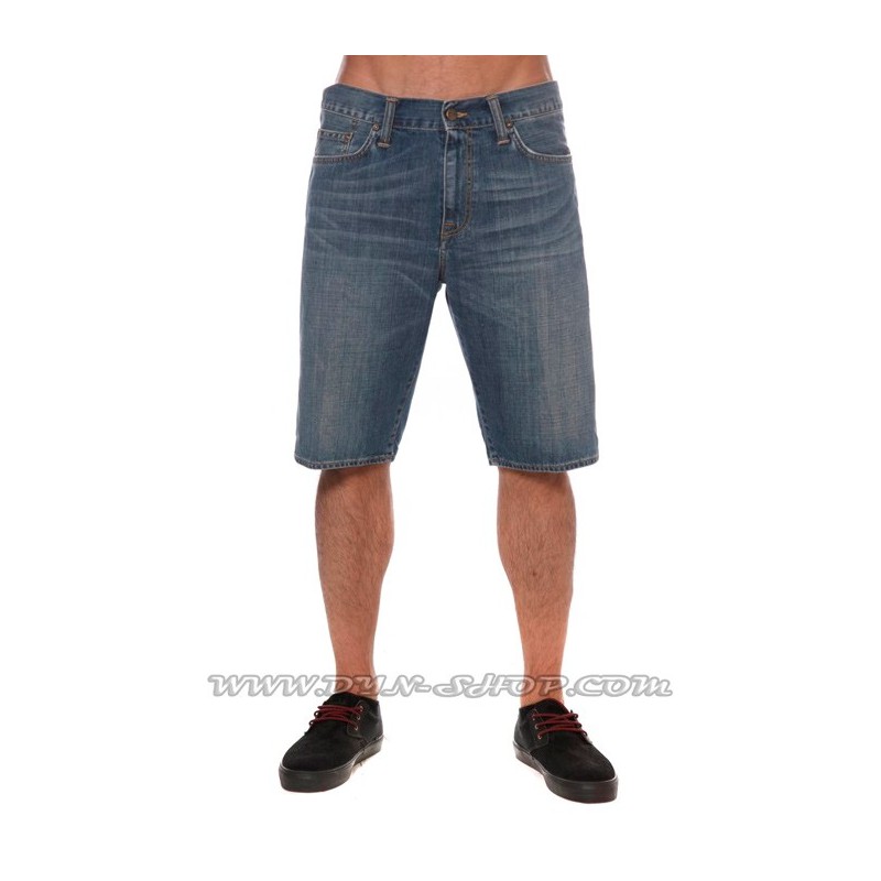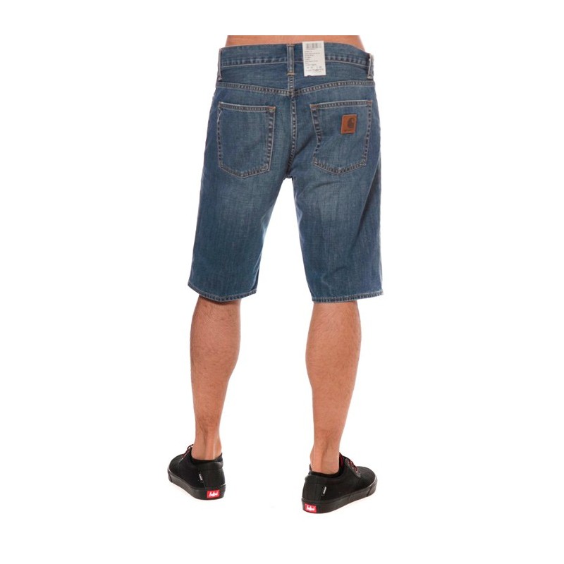 Bermudas Carhartt wip vaqueras, en color azul claro y detalle de la marca en piel marron.